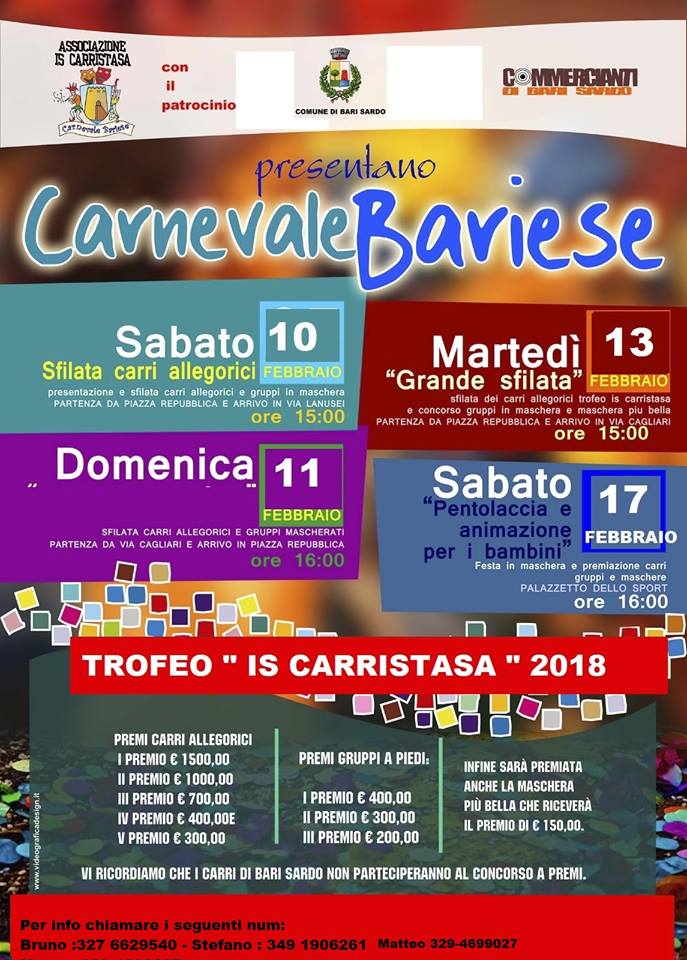 Ma sarà il 13 febbraio 2018 (ore 15) il giorno della Grande Sfilata dei carri allegorici che partecipano al Trofeo IS CARRISTASA 2018, indetto dall’omonima associazione organizzatrice dell’evento in collaborazione con il Comune di Bari Sardo e i Commercianti della città. Oltre ai prime 5 carri classificati saranno premiati anche 3 gruppi in maschera e la maschera più bella che riceveranno un premio in denaro.