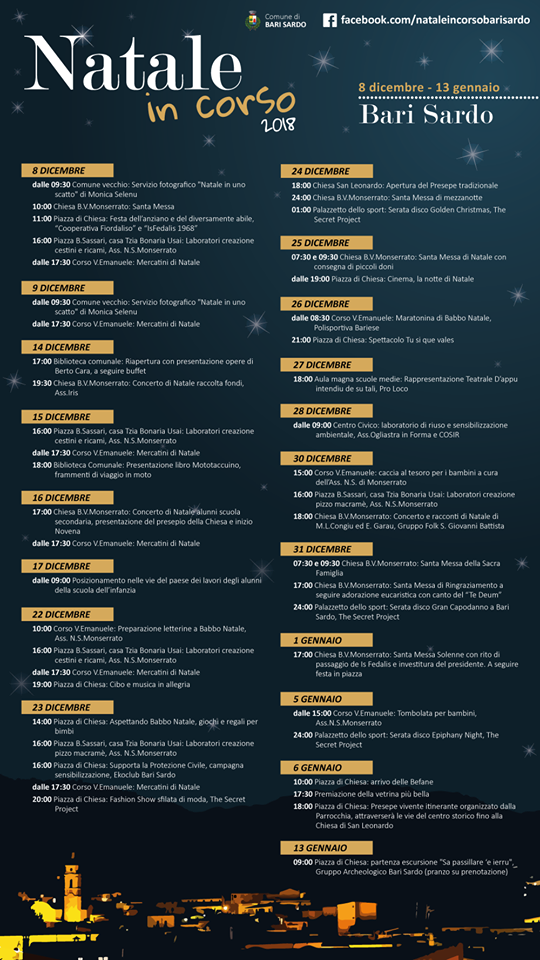 Tutto pronto a Bari Sardo, nel cuore della regione storico geografica dell’Ogliastra, dove sono già iniziati i festeggiamenti per le imminenti festività natalizie di questo 2018: lo scorso 8 dicembre, infatti, è iniziata la manifestazione "Natale in corso”, una kermesse ricca di appuntamenti per grandi e piccoli, che sapranno stupire ed emozionare, aiutando la riscoperta degli antichi sapori di questa magica terra della Sardegna.